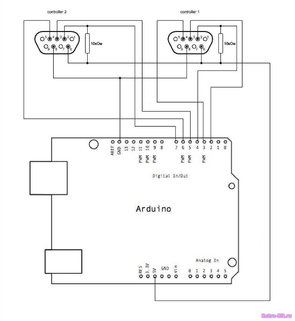 Схема подключения к "Ардуино Леонардо" и скетч, приведены ниже. Стоит отметить, что "питание" и data, нужно соединить подтягивающим резистором 10кОм. Это нужно на случий отсоединения джойстика от разъёма. Что-бы data продолжал оставаться в электрической цепи.